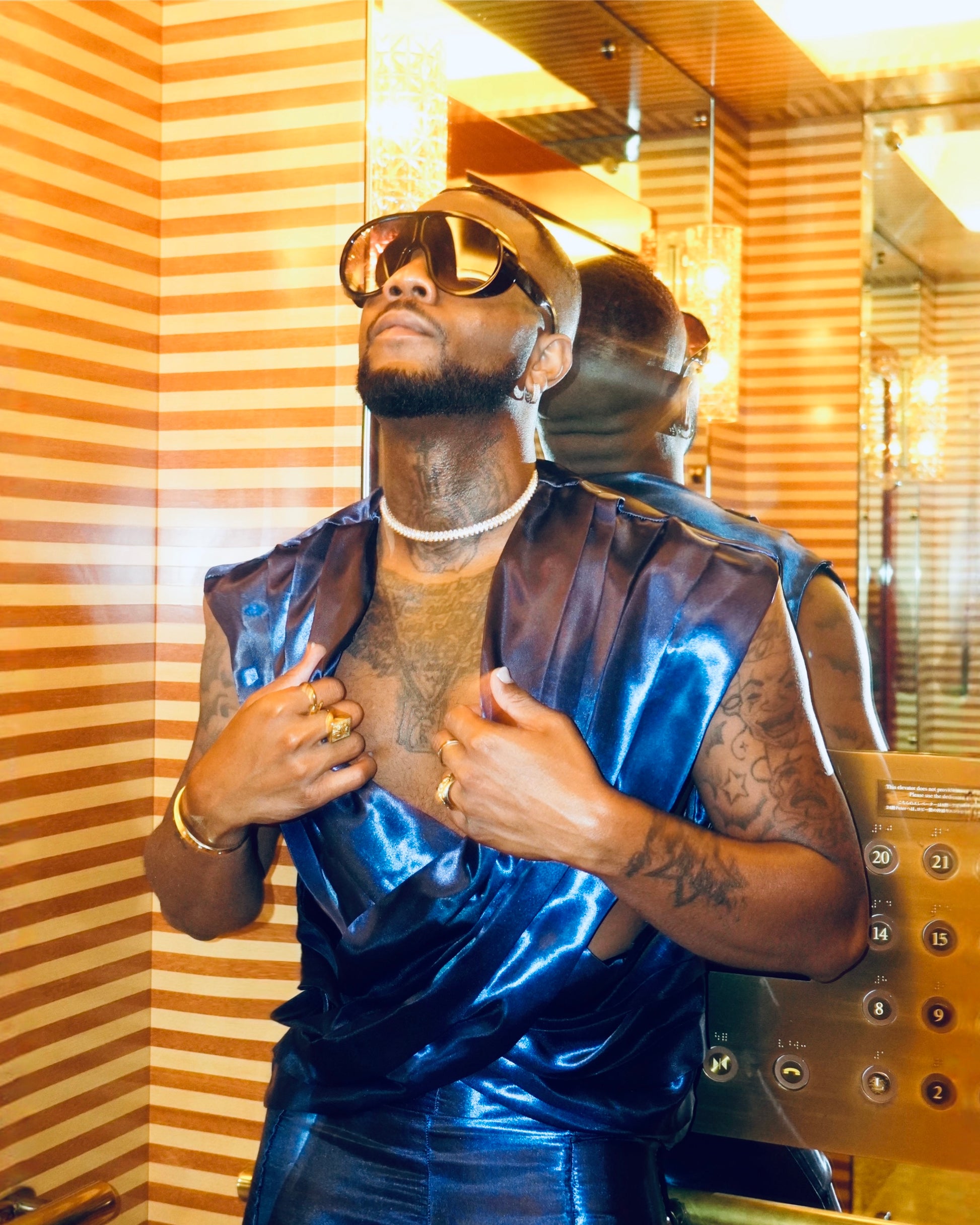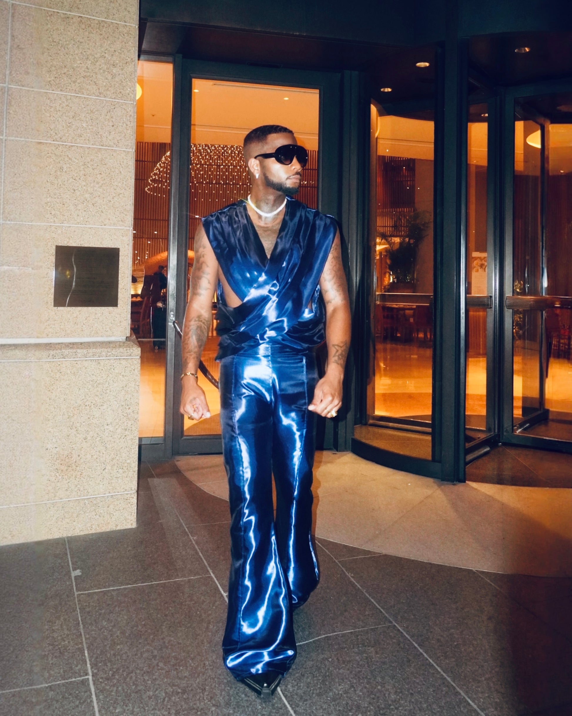 Satin setThe Tokyo Night Blue Set is the perfect addition to any special occasion or a night out in the city. Crafted with 100% satin fabric, this non-stretch set features a sleeveless top and high waist flared pants with an invisible zipper. Elevate your style with this elegant and sophisticated satin set. For customization email info@elevation12.com